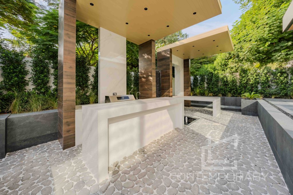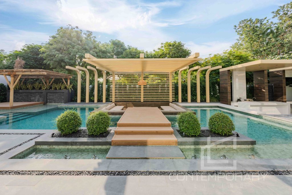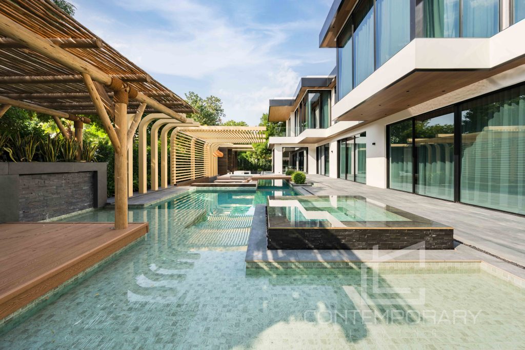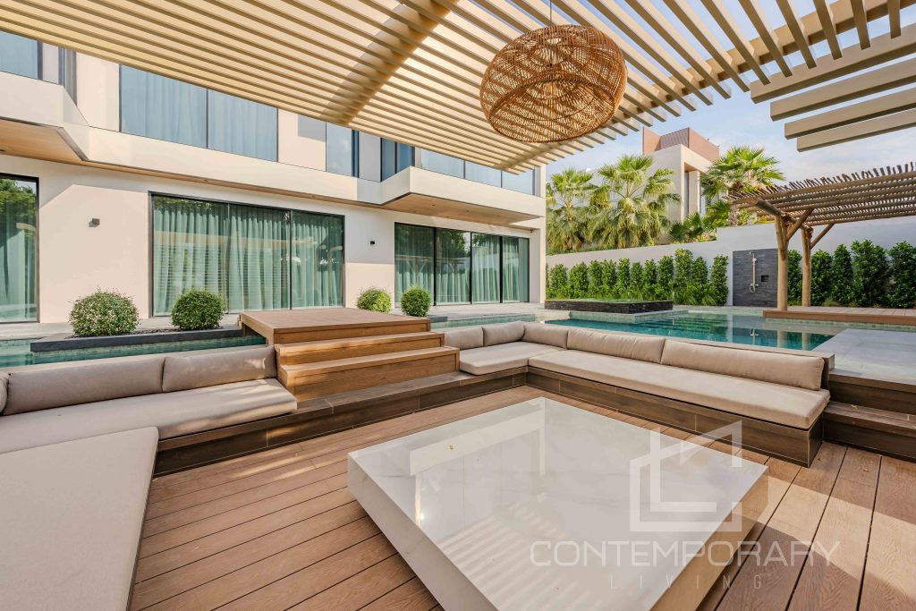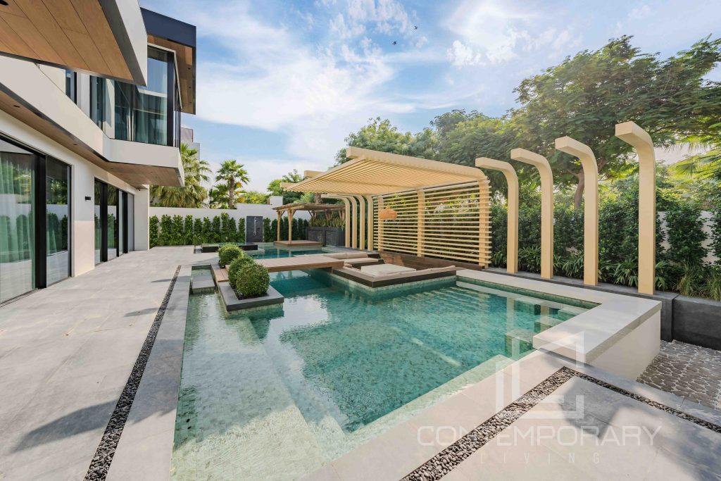 The client sought a renovation that blended modern elegance with traditional charm for their 5-bedroom standalone villa. The renovation’s centrepiece was a spacious, open-plan living and dining area designed to be family-friendly. Enhancements included a games room with a home cinema, pool table, and bar. The villa’s standout feature was its unique circular swimming pool, complete with a swim-up bar and an entertainment area centred around a fire pit.