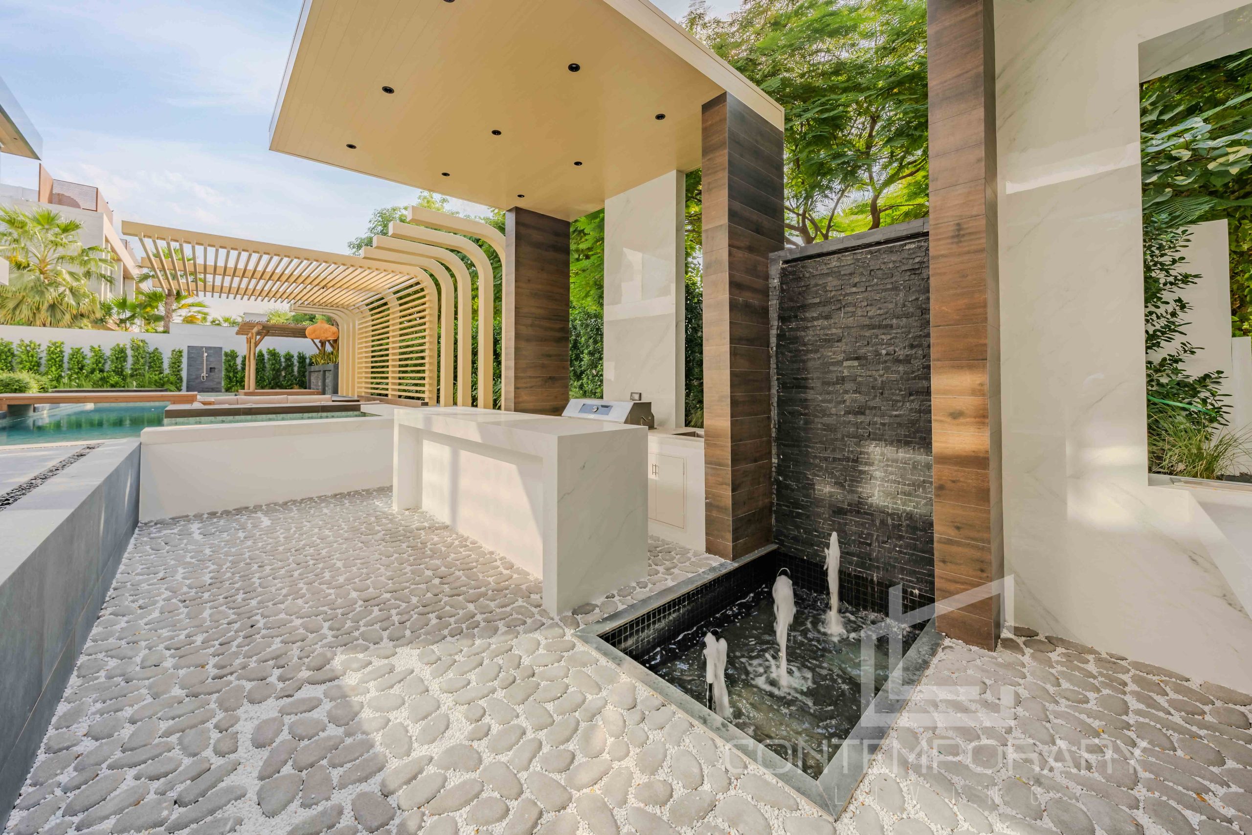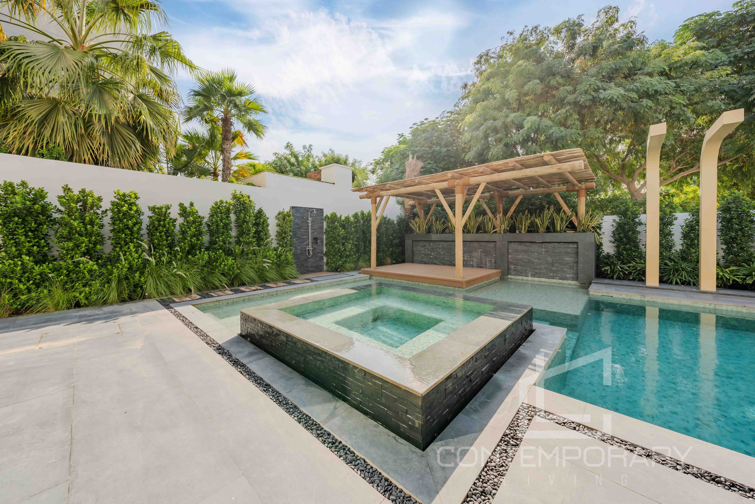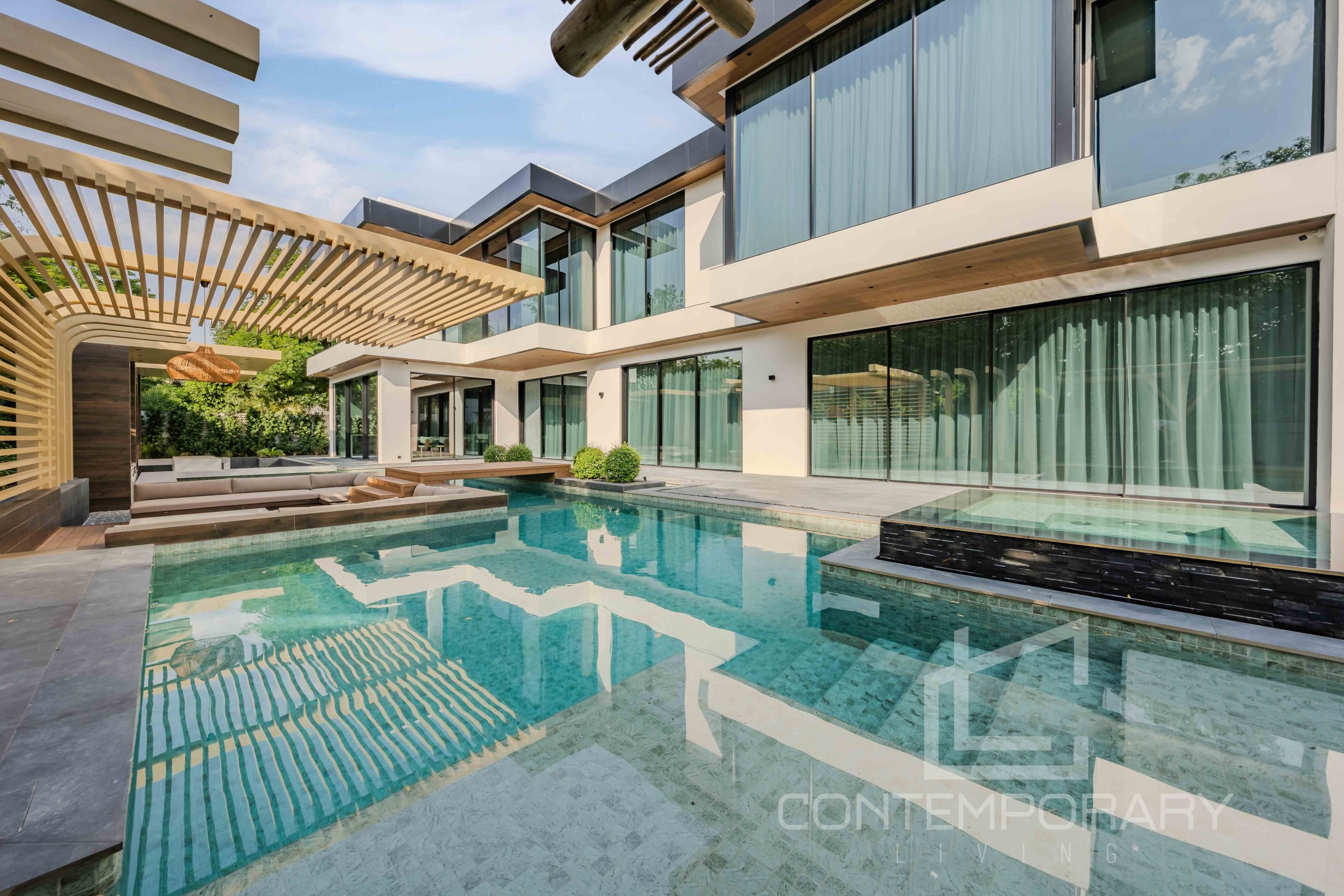 The client sought a renovation that blended modern elegance with traditional charm for their 5-bedroom standalone villa. The renovation’s centrepiece was a spacious, open-plan living and dining area designed to be family-friendly. Enhancements included a games room with a home cinema, pool table, and bar. The villa’s standout feature was its unique circular swimming pool, complete with a swim-up bar and an entertainment area centred around a fire pit.