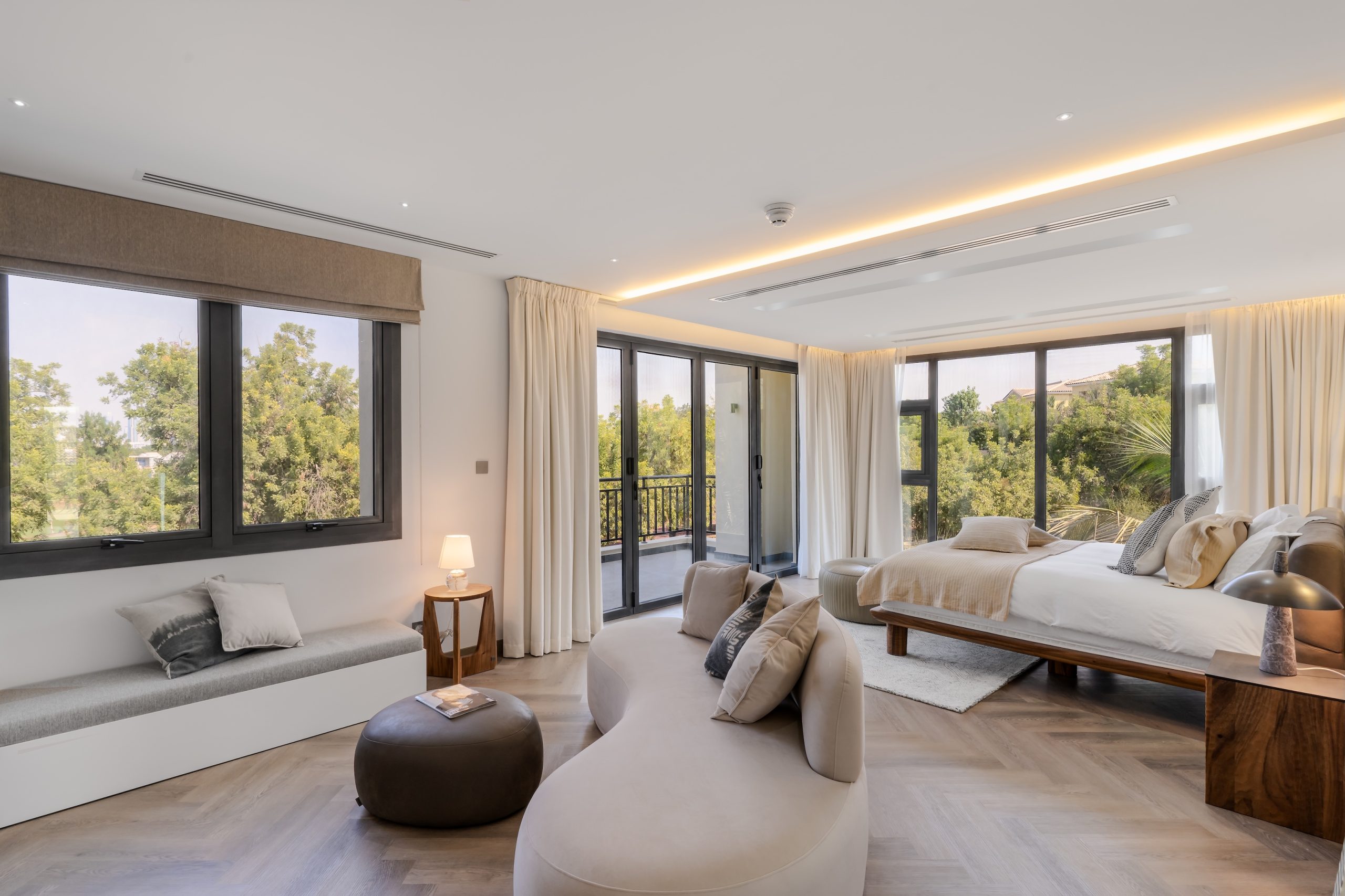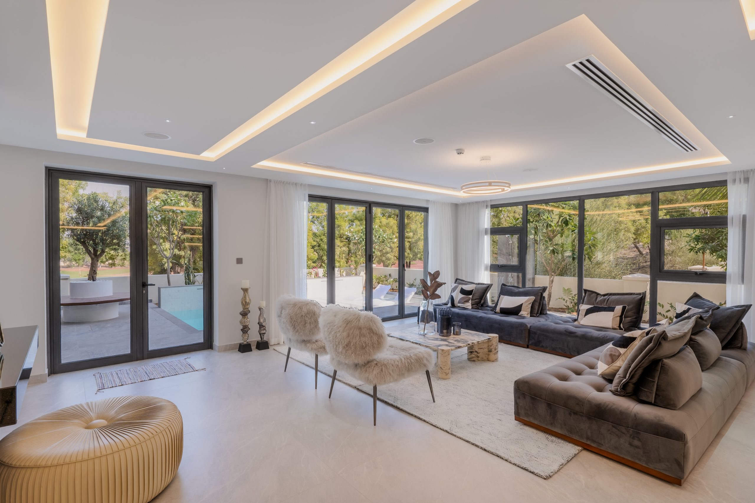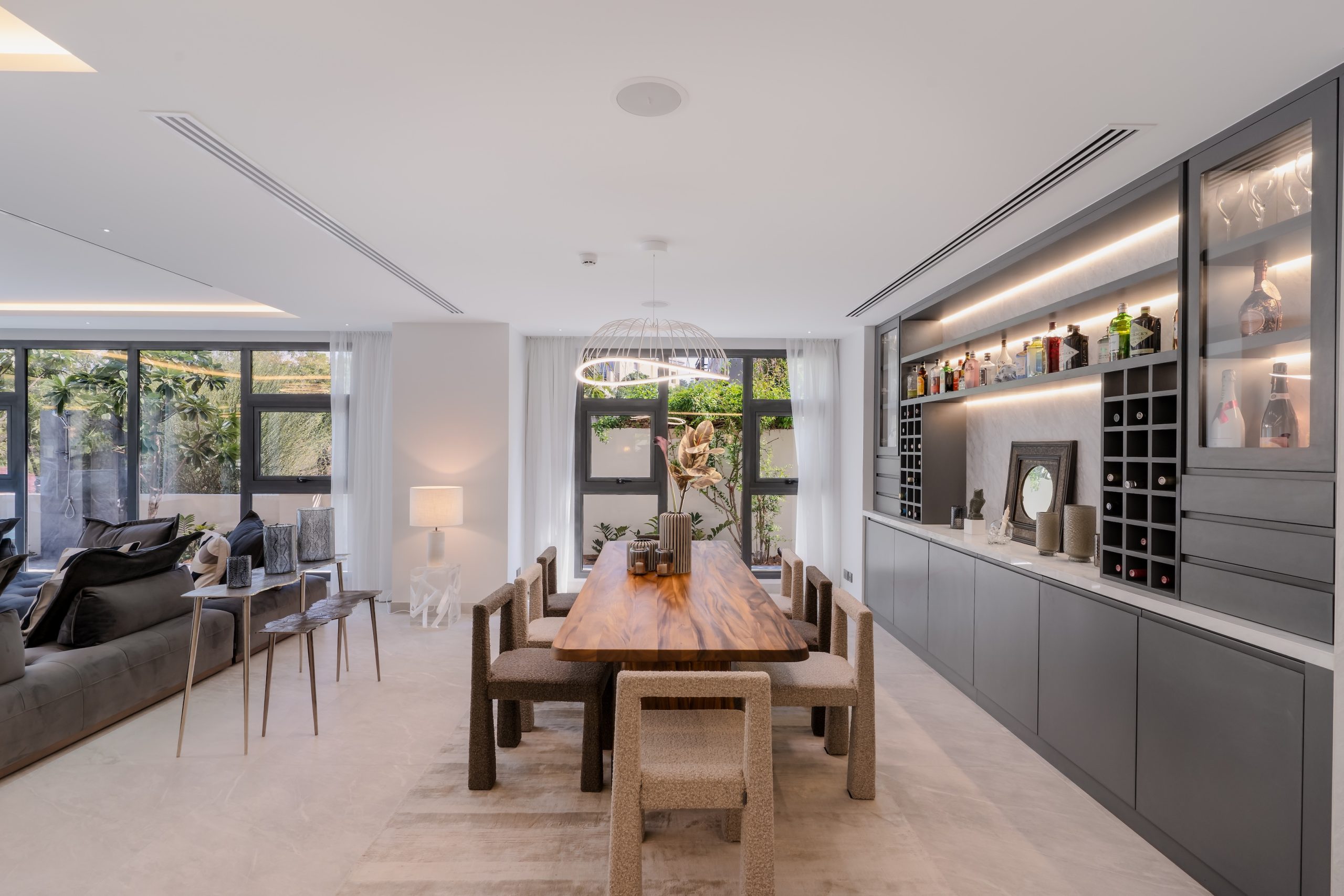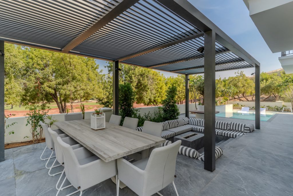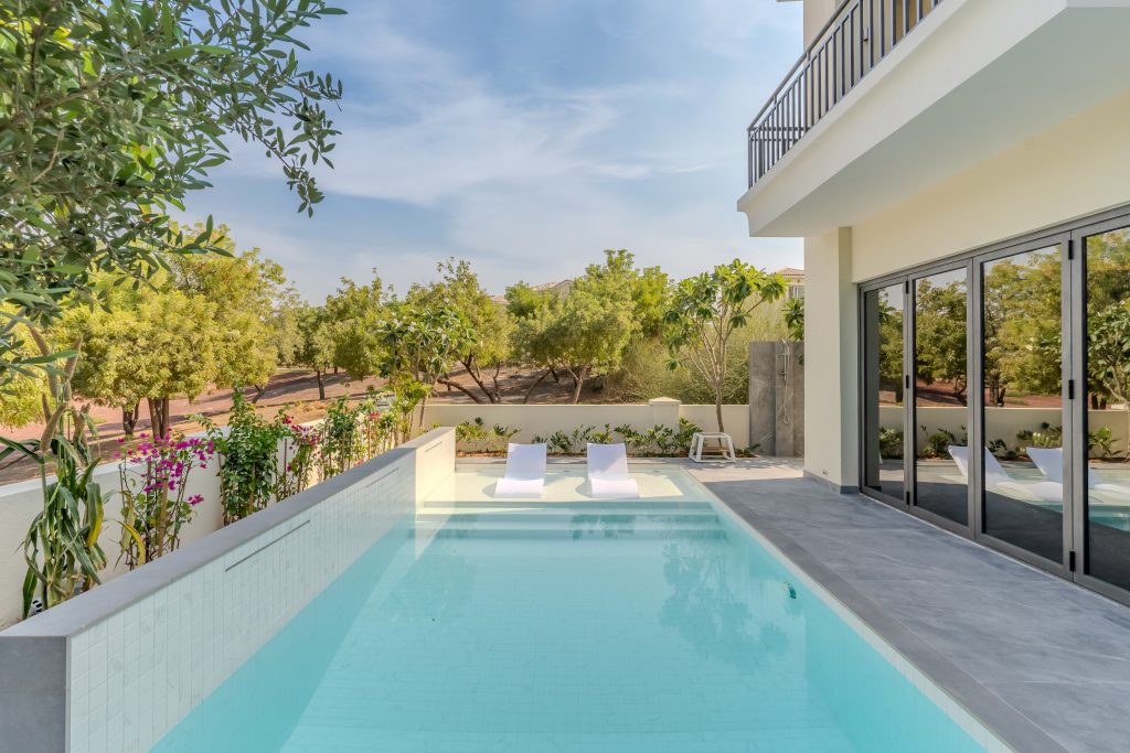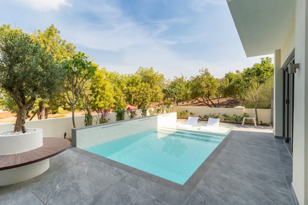 The client sought a renovation that blended modern elegance with traditional charm for their 5-bedroom standalone villa. The renovation’s centrepiece was a spacious, open-plan living and dining area designed to be family-friendly. Enhancements included a games room with a home cinema, pool table, and bar. The villa’s standout feature was its unique circular swimming pool, complete with a swim-up bar and an entertainment area centred around a fire pit.