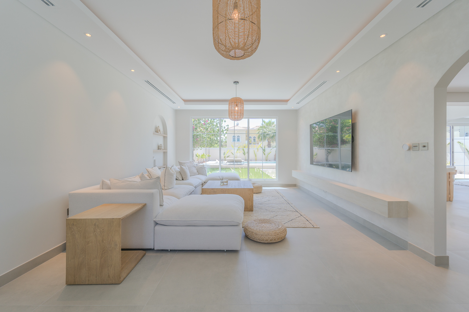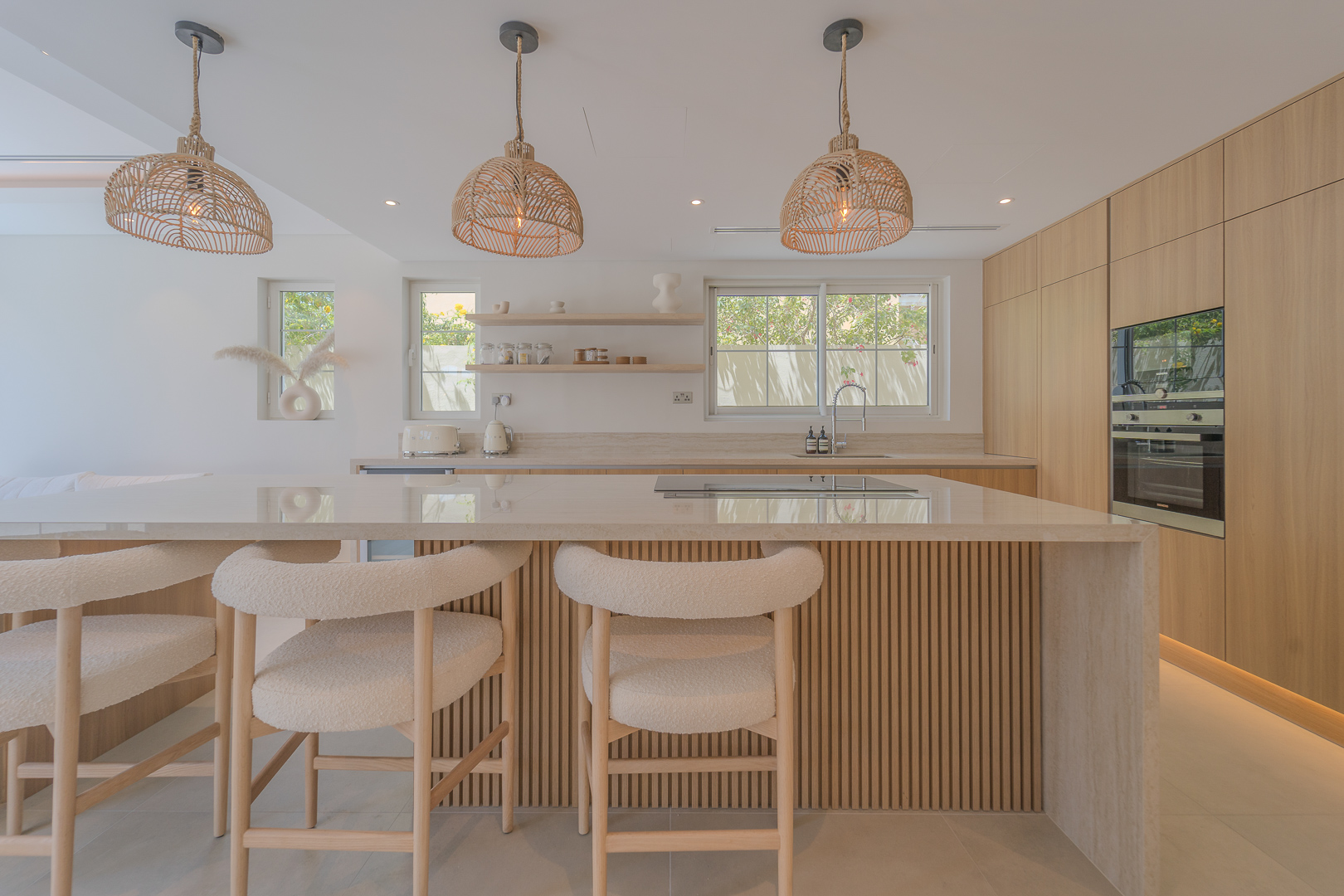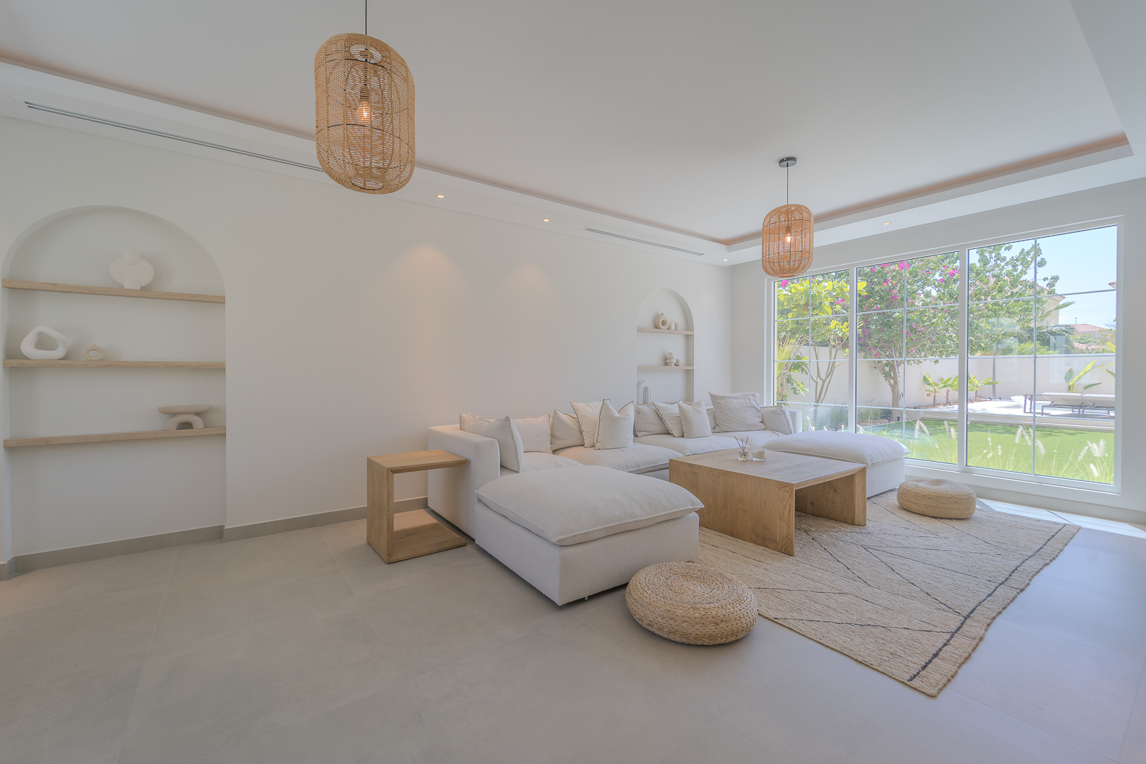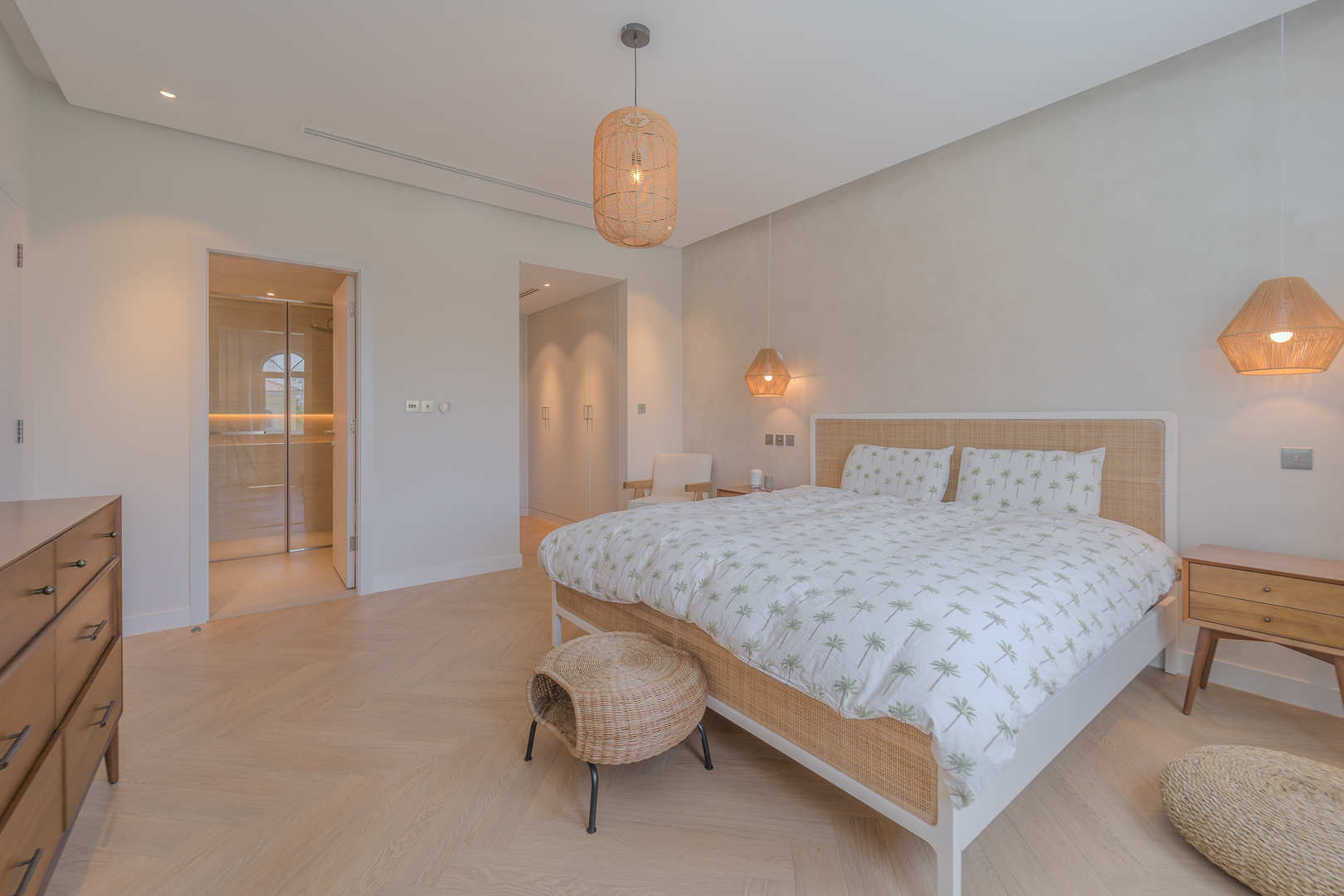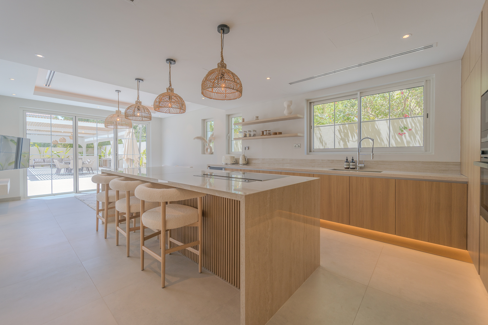 The client sought a renovation that blended modern elegance with traditional charm for their 5-bedroom standalone villa. The renovation’s centrepiece was a spacious, open-plan living and dining area designed to be family-friendly. Enhancements included a games room with a home cinema, pool table, and bar. The villa’s standout feature was its unique circular swimming pool, complete with a swim-up bar and an entertainment area centred around a fire pit.