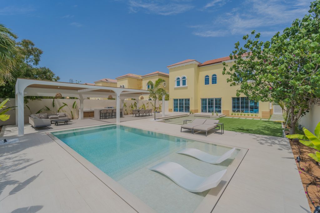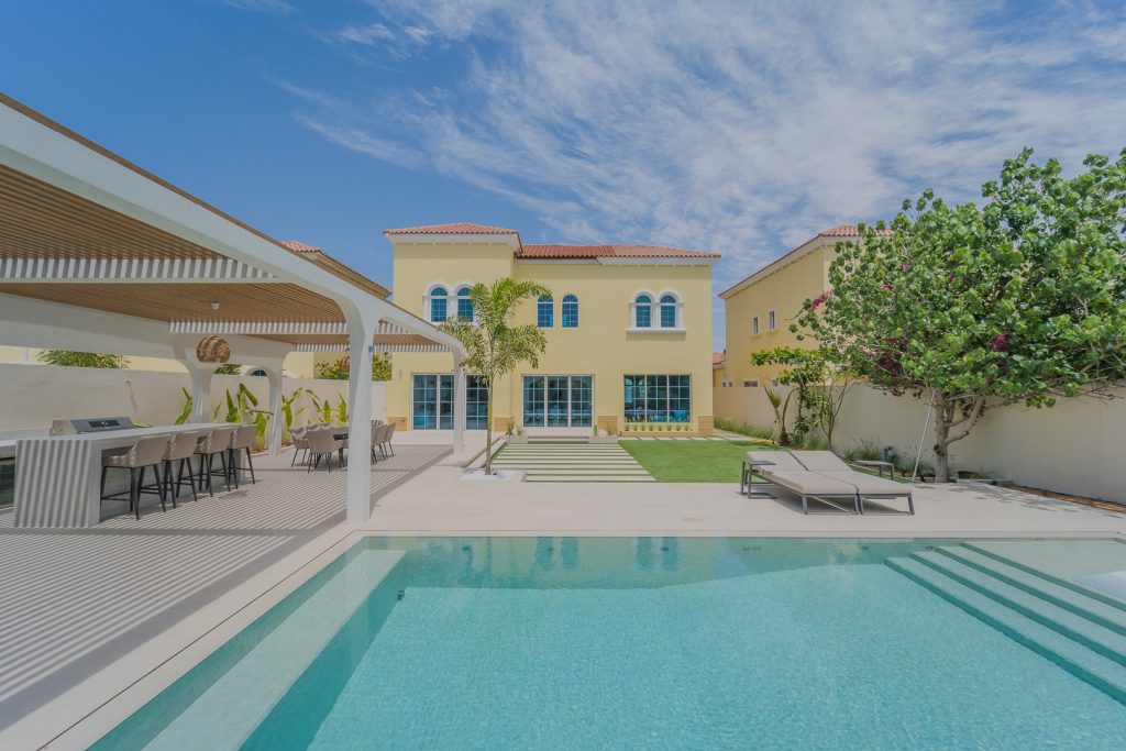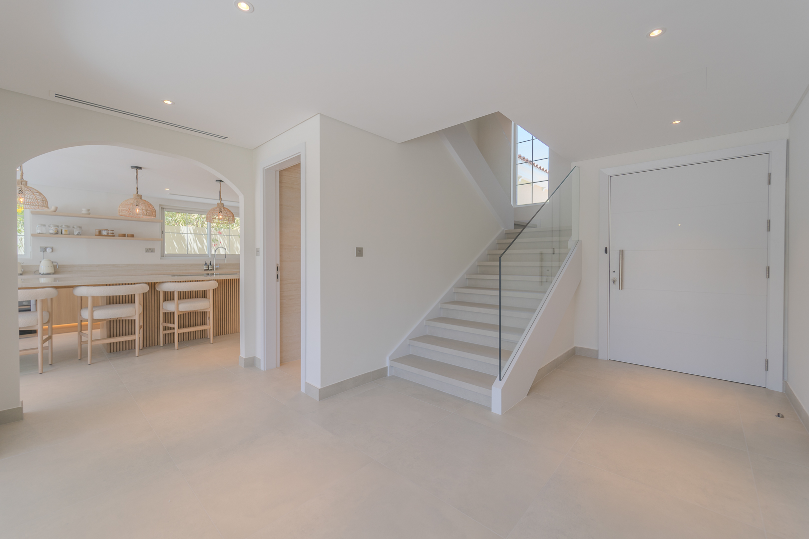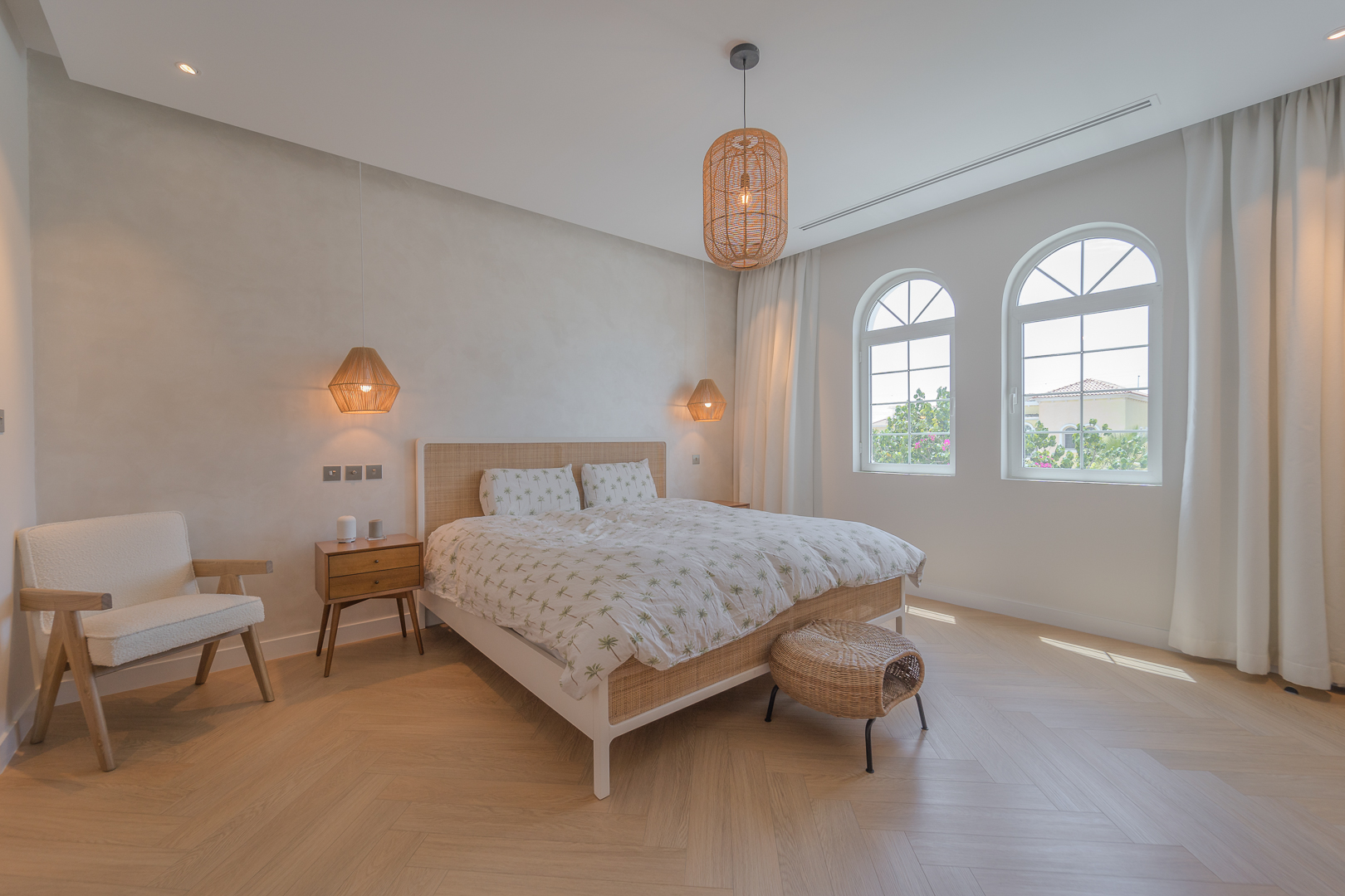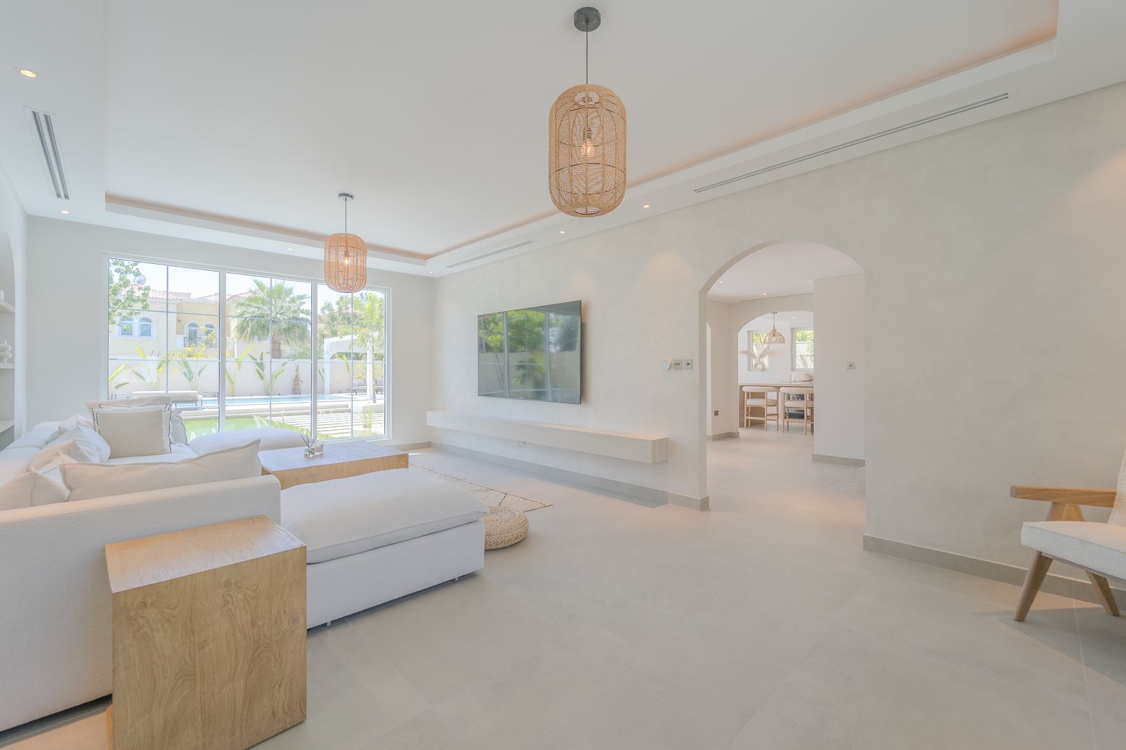 The client sought a renovation that blended modern elegance with traditional charm for their 5-bedroom standalone villa. The renovation’s centrepiece was a spacious, open-plan living and dining area designed to be family-friendly. Enhancements included a games room with a home cinema, pool table, and bar. The villa’s standout feature was its unique circular swimming pool, complete with a swim-up bar and an entertainment area centred around a fire pit.